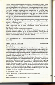 Am 30. Mai 1961 veröffentlichte Dr. Bohumil Schneider in der Prager Tages- zeitung "rude pravo" Auszüge aus Schriftstücken zur Geschichte des Slowa- kischen Staates und seiner Abhängigkeit von Deutschland einerseits und der Deutschen Partei in der Slowakei andrerseits. Leiter dieser Organisation war Franz Karmasin, damals zugleich Staatssekretär für Deutsche Ange- legenheiten im Kabinett Tiso. Adjutant von Karmasin war Ludwig Dostal, der sich später in Dollmann umbenannte (Siehe Seite 269). Dessen Anschrift dann im Februar/März 1944 Dr. Globke dem Reichsinnenministerium angab, für den Fall, daß man ihn während seines Krankenurlaubs in der Slowakei erreichen wollte. Die von Dr. Bohumil Schneider veröffentlichten Auszüge enthalten unter - anderem folgende Passagen:* Aus einem Brief Dostal/Dollmanns an Dr. Globke (31. Oktober 1941): Hiermit überreiche ich Ihnen meine Obersetzung des slowakischen Judenkodexes zu Ihrer Kenntnisnahme sowie für Herrn Staatssekretär Stuckart und Herrn Re- gierungsrat Ecke/berg. Die Antwort aus dem Reichsinnenministerium: Ich danke Ihnen • sehr herzlich für Ihre Arbeit am slou;akischen Judengesetz. Als Gegengabe würde ich Ihnen gern den von mir und Staatssekretär Stuckart verjaßten Kommentar zu den Nürnberger Gesetzen übersenden, aber leider habe ich nur ein einziges·Exemplar und die gedruckte Auflage ist vergriffen. Auch das basiert auf der 11. Verordnung zum Reichsbürgergesetz. (Siehe Seite 120) Aktenz. Pol. 4 Nr. 2 Nr. 2578 1 Durchdruck Verbalnote Die Deutsche Gesandtschaft beehrt sich dem Ministerium des Äußeren der Slowakischen Republik im Anschluß an ihre Verbalnote vom 29. April1942 - Aktenz.: Pol. 4 Nr. 2 Nr. 2565 - mitzuteilen, daß die deutsche Reichs- regierung die aus dem Gebiet der Slowakei in das Reichsgebiet abbeförder- ten und noch zu befördernden Juden grundsätzlich nicht mehr in die Slowakei zurückbefördern wird. Ferner erklärt die Deutsche Gesandtschaft, daß die deutsche Reichsre-· gierung keinen Anspruch auf das Vermögen der evakuierten Juden bisher slowakischer Staatsangehörig keif erheben wird. Die zu künftige Regelung bezüglich der Vermögen der in Deutschland befindlichen Juden slowa- kischer Staatsangehörigkeit und der in die Slowakei emigrierten Juden deutscher bzw. ehemals deutscher Staatsangehörigkeit bleibt hiervon unberührt. Unberührt bleibt ferner die mit der nebenbezeichneten Ver- balnote vorgeschlagene Regelung hinsichtlich der Bezahlung von 500,- RM für jeden durch das Reich übernommenen Juden. Preßburg, den 1. Mai 1942 An das Ministerium des Äußeren der Slowakischen Republik in Preßburg 218 *Alles rückübersetzt aus "rude pravo" vom 30. 5· 1961 . ---