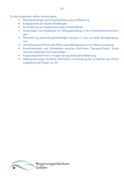 – 26 – Zu den Angeboten zählen insbesondere: • Niedrigschwellige psychosoziale Betreuung und Beratung • Erstgespräche bei akuten Belastungen • Durchführung von Gesprächsrunden mit Betroffenen • Organisation von Angeboten zur Alltagsgestaltung in den Erstaufnahmeeinrichtun- gen • Weiterleitung behandlungsbedürftiger Personen in das vernetzte Versorgungssys- tem • Vermittlung weiterführender Hilfen sowie Mitorganisation der Weiterversorgung • Zusammenarbeit und Schnittstelle zwischen Ärzt*innen, Therapeut*innen, Sozial- diensten, Behörden und Unterkünften • Ansprechpartner*innen in Fragen der psychosozialen Betreuung • Fallbesprechungen, fachliche Information und Beratung der im Rahmen der Flücht- lingsbetreuung Tätigen vor Ort