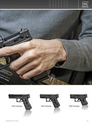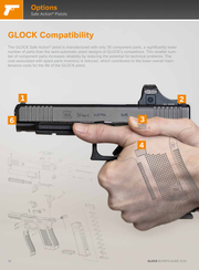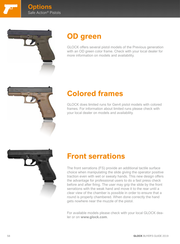 Options Safe Action Pistols ® OD green GLOCK offers several pistol models of the Previous generation with an OD green color frame. Check with your local dealer for more information on models and availability. Colored frames GLOCK does limited runs for Gen4 pistol models with colored frames. For information about limited runs please check with your local dealer on models and availability. Front serrations The front serrations (FS) provide an additional tactile surface choice when manipulating the slide giving the operator positive traction even with wet or sweaty hands. This new design offers the advantage for professional users to do a fast press check before and after firing. The user may grip the slide by the front serrations with the weak hand and move it to the rear until a clear view of the chamber is possible in order to ensure that a round is properly chambered. When done correctly the hand gets nowhere near the muzzle of the pistol. For available models please check with your local GLOCK dea- ler or on www.glock.com. 58 GLOCK BUYER'S GUIDE 2019