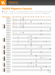 Magazines Safe Action Pistols ® GLOCK Magazine Capacity Standard Optional Extended floor plate (+1 round) Extended floor plate (+2 rounds) For information on compatibility within caliber groups and models please check with your local dealer or on www.glock.com. Magazine Capacity 31+2 24 22 17+2 17 15+2 15+1 15 13+1 13 10+2 10 9+1 9 8 6 GLOCK 17 GLOCK 19X GLOCK 19 GLOCK 26 9 mm Luger GLOCK 34 GLOCK 17L GLOCK 43 GLOCK 43X GLOCK 45 GLOCK 48 GLOCK 22 GLOCK 23 40 S&W GLOCK 24 GLOCK 27 GLOCK 35 GLOCK 25 380 Auto GLOCK 28 GLOCK 42 10 mm Auto GLOCK 20 GLOCK 29 GLOCK 40 GLOCK 21 45 Auto GLOCK 30 GLOCK 36 GLOCK 41 GLOCK 31 357 SIG GLOCK 32 GLOCK 33 GLOCK 37 45 GAP GLOCK 38 GLOCK 39