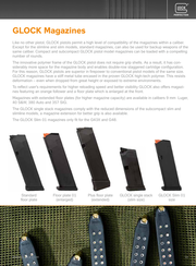 GLOCK Magazines Like no other pistol, GLOCK pistols permit a high level of compatibility of the magazines within a caliber. Except for the slimline and slim models, standard magazines, can also be used for backup weapons of the same caliber. Compact and subcompact GLOCK pistol model magazines can be loaded with a compelling number of rounds. The innovative polymer frame of the GLOCK pistol does not require grip shells. As a result, it has con- siderably more space for the magazine body and enables double-row staggered cartridge configuration. For this reason, GLOCK pistols are superior in firepower to conventional pistol models of the same size. GLOCK magazines have a stiff metal tube encased in the proven GLOCK high-tech polymer. This resists deformation – even when dropped from great height or exposed to extreme environments. To reflect user's requirements for higher reloading speed and better visibility GLOCK also offers magazi- nes featuring an orange follower and a floor plate which is enlarged at the front. Magazines with extended floor plates (for higher magazine capacity) are available in calibers 9 mm Luger, 40 S&W, 380 Auto and 357 SIG. The GLOCK single stack magazines comply with the reduced dimensions of the subcompact slim and slimline models, a magazine extension for better grip is also available. The GLOCK Slim 01 magazines only fit for the G43X and G48. Standard Floor plate 01 Plus floor plate GLOCK single stack GLOCK Slim 01 floor plate (enlarged) (extended) (slim size) size WWW.GLOCK.COM 55