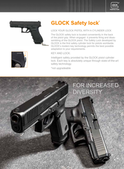 GLOCK Safety lock * LOCK YOUR GLOCK PISTOL WITH A CYLINDER LOCK The GLOCK safety lock is located conveniently in the back of the pistol grip. When engaged it prevents firing and disas- sembling of the GLOCK pistol. The Safety Lock developed by GLOCK is the first safety cylinder lock for pistols worldwide. GLOCK’s modern key technology permits the best possible adaptation to your requirements. LOCKED KEY AND LOCK: Intelligent safety provided by the GLOCK pistol cylinder lock. Each key is absolutely unique through state-of-the-art safety technology. *not upgradeable FOR INCREASED DIVERSITY WWW.GLOCK.COM 59