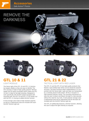 Accessories Safe Action Pistols ® REMOVE THE DARKNESS GTL 10 & 11 GTL 21 & 22 LIGHT MODULE TACTICAL LIGHT WITH RED LASER The Xenon light of the GTL 10 and GTL 11 illumina- The GTL 21 and the GTL 22 are high-quality products that tes targets reliably so they are easy to identify. The feature a red (visible) laser which can be zeroed for pinpoint GTL housing is made of high quality polymer. Minimal accuracy. The laser functions either independently or in con- weight and an easily accessible switch makes the GTL junction with the Xenon-light. Light and laser are manipulated 10 and 11 ideal for low light shooting. Designed to by a centrally placed mode-switch. All this is housed in a work specifically with GLOCK pistols equipped with high-resistant polymer casing. The mounting mechanism al- mounting rails, the GTL 10 and GTL 11 are similar, but lows the user to attach and detach the light in a few seconds with the GTL 11 having an added dimmer function. without the need for any tools. A hard polymer storage case, a replacement bulb and an adjustment tool for the laser are A hard storage case made of high resistant polymer included with this GLOCK Tactical Light set. as well as a replacement bulb are included with each GLOCK Tactical Light set. The GTL 22 additionally features a dimmer function, allowing the user to adjust the light intensity as required. 60 GLOCK BUYER'S GUIDE 2019