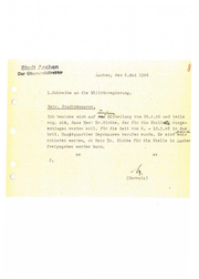 A~chen , den 6 . Mai 1946 l . Schreibe an die Militärreeierung . ( Betr . Stadtkämmerer . ~~ Ich beziehe mich auf ~ ~itteilung vom 26 . 4.46 und teile erg . mi t, dass Her r Dr . Globke , der flir die Stell~ vorge - schlagen werden eoll , f'ir die Zeit vom 6 . - 10 . 5 . 46 in daet:, brit . Hauptquartier Oeynhaueen berufen wurde . Es wird~ schieden wer j en , ob Herr Dr . Globke flir die Stelle in Aacher freieegeben werden kann . XX XX 2. ~. c / (Servals) '