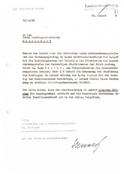 Auszunsweise 't bschrift aus der 15o . Si tzun;.r des Kabin •-tts des Landes Nord- rhein- Westfalen am 8 . 8 . 1949 in Düsselt}orf . -.-.-.-.-.-.-.-.-.-.-.-.- PP • PP • PP · Zu 17 ) Personalien vrurden Dr . Hws . Globke zwn Vizepräsidenten des Ln.ndesrecllnu.n- shofe s und Ree . J.at ·\u.q;nst Hovcrmann zwn Ar·Jei ts ;ericlltsdirel:tor ernannt . PP • PP · ( P!) • ~e schlos-sen : r~ez . Dr . W:;mdersleb -.-.-.-.-.-.-.-.-.-.-. Der Chef der Landeslc<u:.zlei Düsseldorf , den 1 5 . 8 . 49 des Landes Nord~:cin-Westf,lnn A/oo1 - 2 / '/ • An den Präsielenten des Larldesrechnunßsl.ofes Herrn Dr . Schrader Düsseldorf c· l'~ath .~rs tr3.sse Abschrift übersende i ch ztu:- gefl . K··nntnis unter Bezug auf die telefonische Abmachung • . ..