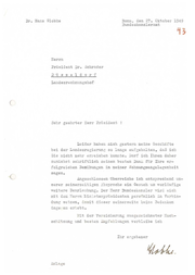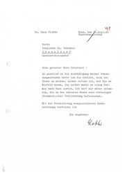 Dr . Hans Globke Bonn, den 27 . Oktober 1949 Bundeske~zlerumt Herrn Präsident Dr • .::3chrz.der Dü s s e 1 d o r f Landesr~clmun g shof ( Sehr geehrter Herr Prlisident Leider haben mi ch gestern meine Geschäfte bei der L and esre g ierlm~ so lange a~f0ehalten , daß ich Sie nicht mehr t:rreic~len konnte . Da.rf ich Ibnen daher ztm8.chst schriftl i ch meinen besten Dan.L für I hre er- folgreichen BemLibunt;en in meiner .Vohnunesa.ngelegen!1e i t sagen . ( Angeschlossen überre i che ich entsprechend un- serer seinerze:itigen J:..'bsprache e i n Ge such um vorl 2.ufi ge we i tere Beurlcru.bunt; . Der Herr Bundeskanz ler vlirJ s ich mit den: :'errn kin.:_8terpräsidenten persönlich in VC;::-bin- dung setzen , damit dieser seinerse:i ts ::reine :Bed:;;;.Lken dage en erl1ebt . ~ 1 it der Ve rs ic:1ernng ausgeze ichneter Eocl:.- schitzung tmd besten .Jmpfehlm16en verbleibe ich Ihr e q:;ebener Anlage
