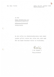 Dr . Hans Globke Bonn , den 27 . vktober 1949 BundeGLanzl eramt An den He r rn Präsi denten des Landesr e cl..nu.ngshofes D ü s s e 1 d o r f Ratherstr aRe ( Da der Aufbau des Bundeskanzl eramtE:s noch n icht zuende g efiihrt •:iorden i st , bitte i ch , mi ch auch f ür den Monat Novembe r wei ter zu beurl auben . ( Dr . Globke ) Vi zepräsi dent