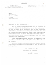 Abschrift / Der Präsident Düsseldorf , den 2 . Dezember l des Landesrec~~~gshofs Ratherstr . 49 a des Landes Nordrhein- v estfalen Herrn Vize präsident Dr . G 1 o b k e B o n n Bundeskanzleramt Sehr geehrter Herr Vizepräsident ! ( Au~ Ihr frev~dliches Schreiben vom 30 . 11 . 49 erwiedere ich ergebenst , daß ich fi.i.r die Si tuat:!..on, in der Ihre Behörcle und Sie sich befinden, volles Verständnis habe und auch die Notwen- digkai t Ihres mindestens einstweiligen Verbleibans in Bonn durc. aus einsehe , 7/erm ich es auch sehr bedaure , auf Ihre Mitarbeit weiterhin verzichten zu müssen, habe ich mich deshalb anderer- seits doch bereits darauf eingestellt , längere Zeit ohne einen Vizepräsidenten auszukommen . Ihrem Wunsche entsprechend beurlaube ich Sie deshalb mit dem selbstverständlichen Vorbehalt jederzeitigen Widerrufs bis auf weiteres . ( !.iit Herrn Ministerpräsident Arnold werde ich bei nächster sich bietende..:· Gelegenheit im gleichen Sin..11e über die Angelegen· heit sprechen . :.:i t verbindlichem Gruß bleibe ich Ihr ergebener gez . Dr . Sehrader