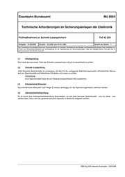 Eisenbahn-Bundesamt Mü 8004 Technische Anforderungen an Sicherungsanlagen der Elektronik Prüfmaßnahmen an Schreib-Lesespeichern Teil 43 333 Ausgabe: 01.08.2003 Ersetzt: 43 333E vom 01.01.1990 Anzahl der Seiten: 1 Die Technischen Grundsätze dienen der Zusammenarbeit von Industrie, Eisenbahnen des Bundes und Eisenbahn-Bundesamt beim Aufstellen und Prüfen von Sicherheitsnachweisen als Voraussetzung für die Typzulassung von Sicherungsanlagen. Über die Gültigkeit dieses Teils gibt das In- haltsverzeichnis (Teil 00 001) Auskunft. (1) Inhaltsprüfung Der Inhalt des benutzten Teils des Schreib-Lesespeichers ist auf Unversehrtheit zu prüfen. (2) Schreib-/Leseprüfung Jede benutzte Speicherzelle ist mindestens mit den für die vorliegende Speicherorganisation erforderlichen Bitmus- tern pro Speicherstelle auf fehlerfreies Schreiben und Lesen zu prüfen. Anmerkung: Eine Speicherstelle fasst die pro Adresse ansprechbaren Bits zusammen. (3) Erforderliche Bitmuster Die erforderlichen Bitmuster nach Regel 2 müssen abhängig von der Speicherorganisation definiert werden. (4) Adressierbarkeitsprüfung Es ist durch eine Adressierbarkeitsprüfung festzustellen, ob sich jede benutzte Speicherzelle - und nur diese - aus- wählen lässt. Dazu darf der gesamte benutzte Speicher in Bereiche aufgeteilt werden. EBA Sg 226 internes Exemplar - 226 EBA