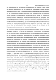 - 26 - Bearbeitungsstand: 27.01.2021 nehmigungen des jeweiligen Bundeslands erforderlich sein. Daher wurde bereits mit der Än- derung des Straßenverkehrsgesetzes (StVG) ein allgemeingültiges dreistufiges Verfahren vorgegeben, welches in dieser Rechtsverordnung im Einzelnen geregelt wird. Die jeweils nachfolgende Stufe bedingt dabei die jeweils vorausgehende Stufe. Bundesweit werden damit einheitliche Verfahrensvorschriften geschaffen, um den Ländern Rechtssicherheit in der Um- setzung des Gesetzes zum autonomen Fahren zu geben. Kern der Verordnung sind daher ne- ben der Regelung der technischen Anforderungen an Kraftfahrzeuge mit autonomer Fahr- funktion die Bestimmung des Kraftfahrt-Bundesamts als zentrale Behörde für die Erteilung von Betriebserlaubnissen für Kraftfahrzeuge mit autonomer Fahrfunktion, die Genehmigung der festgelegten Betriebsbereiche durch die nach Landesrecht zuständigen Behörden, sowie Anforderungen und Sorgfaltsvorschriften für die am Betrieb von Kraftfahrzeugen mit auto- nomer Fahrfunktion beteiligten Personen. IV. Rechts- und Verwaltungsvereinfachung Mit der Bestimmung des Kraftfahrt-Bundesamts als zentrale Behörde für die Erteilung von Betriebserlaubnissen für Kraftfahrzeuge mit autonomer Fahrfunktion und für Erprobungsge- nehmigungen wird eine einheitliche Überprüfung von Kraftfahrzeugen mit autonomer Fahr- funktion gewährleistet. Diese führt zu einer Vereinfachung des Verwaltungsverfahrens und entlastet die einzelnen Bundesländer. Mit der Genehmigung der festgelegten Betriebsbereiche durch die nach Landesrecht zustän- digen Behörden kommt ein neues Verwaltungsverfahren auf die Bundesländer zu. Dabei wird sich der Verwaltungsaufwand jedoch in einem überschaubaren Rahmen halten, da Ausgangs- punkt der Bewertung der festgelegten Betriebsbereiche stets die vom Kraftfahrt-Bundesamt erteilte Betriebserlaubnis für Kraftfahrzeuge mit autonomer Fahrfunktion ist. Auf deren Grundlage muss lediglich die Infrastruktur des örtlichen Betriebsbereichs begutachtet wer- den. Hierzu werden auch amtlich anerkannte Sachverständige oder vergleichbare Stellen be- auftragt werden können. Das Verwaltungsverfahren vor den Zulassungsbehörden wird bei der Zulassung von Kraft- fahrzeugen mit autonomer Fahrfunktion lediglich um die Vorlage der zuvor erteilten Be- triebserlaubnisse und Genehmigungen erweitert. V. Verordnungsermächtigung des Bundesministeriums für Verkehr und digitale Infra- struktur