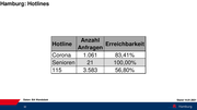 Hamburg: Hotlines Anzahl Hotline Erreichbarkeit Anfragen Corona 1.061 83,41% Senioren 21 100,00% 115 3.583 56,80% Daten: BA Wandsbek Stand 14.01.2021 32