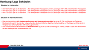 Hamburg: Lage Behörden Situation im Luftverkehr: • Am 15.01.2021 gab es 36 Starts mit 1.862 abfliegenden Passagieren und 34 Landungen mit 1.958 ankommenden Passagieren. • Am 16.01.2021 gab es 19 Starts mit 1.295 abfliegenden Passagieren und 18 Landungen mit 1.609 ankommenden Passagieren. • Am 17.01.2021 gab es 29 Starts mit 1.743 abfliegenden Passagieren und 29 Landungen mit 2.228 ankommenden Passagieren. Situation im Individualverkehr: • Das durchschnittliche Kfz-Verkehrsaufkommen auf Hauptverkehrsstraßen lag in der 2. KW von Montag bis Freitag im Durchschnitt rund 24 % unter der entsprechenden durchschnittlichen täglichen Verkehrsstärke an Werktagen und hat damit im Vergleich zur vorhergehenden KW leicht zugenommen. • Das durchschnittliche Aufkommen von Radfahrenden lag in der 2. KW von Montag bis Freitag rund 8 % über dem Aufkommen an den Werktagen der vorhergehenden KW. Daten: BWI / BVM / BPol Stand 18.01.2021 31
