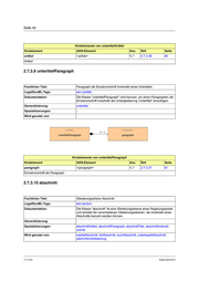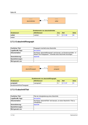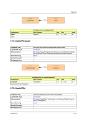 Seite 44 Kindelemente von untertitelArtikel Kindelement AKN-Element Anz. Ref. Seite artikel <article> 1..* 2.7.3.36 60 Artikel 2.7.3.9 untertitelParagraph Fachlicher Titel: Paragraph als Einzelvorschrift innerhalb eines Untertitels LegalDocML-Tags: akn:subtitle Dokumentation: Die Klasse "untertitelParagraph" wird benutzt, um einen Paragraphen als Einzelvorschrift innerhalb der Untergliederung "Untertitel" einzufügen. Generalisierung: untertitel Spezialisierungen: - Wird genutzt von: - «subtitle» «paragraph» [1 , *] untertitelParagraph paragraph Kindelemente von untertitelParagraph Kindelement AKN-Element Anz. Ref. Seite paragraph <paragraph> 1..* 2.7.3.37 61 Einzelvorschrift als Paragraph 2.7.3.10 abschnitt Fachlicher Titel: Gliederungsebene Abschnitt LegalDocML-Tags: akn:section Dokumentation: Die Klasse "abschnitt" ist eine Gliederungsebene eines Regelungstextes und bündelt die verschiedenen Gliederungsebenen, die innerhalb eines Abschnitts benutzt werden können. Generalisierung: - Spezialisierungen: abschnittArtikel, abschnittParagraph, abschnittTitel, abschnittUnterab- schnitt Wird genutzt von: kapitelAbschnitt, teilAbschnitt, buchAbschnitt, unterkapitelAbschnitt, stammformGliederung 1.0 / Final Regelungsentwurf