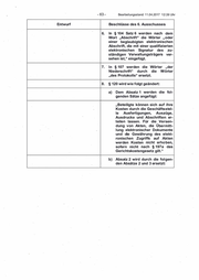 - 68 - Bearbeitungsstand: 1 1 .04.201 7 1 2:39 Uhr. Entwurf Beschlüsse· des 6. Ausschusses "(6) Werden . die Prozessak ten elektronisch gefü hrt, s i n d in Papierform vorliegende S chrift stücke und sonstige Unterlagen nach dem Stand der Techn i k zur Ersetzung der Urschrift in ein elektronisches Dokument zu . ü bertragen. Es ist s icherzustel len, dass das elektronische Do- · kument m it den vorliegenden Sch riftstücken und sonstigen U nterlagen bildlich und in halt lich ü berei nstimmt. Das elektro n ische Dokument ist m it e i nem Ü bertragungsnachweis zu ver sehen, der das bei der Ü bertra g ung angewandte Verfahren u nd d ie bildliehe und in haltl iche Ü bereinstimmung dokumentiert. Wird ein von den verantworten den Personen handschriftlich u nterzeichnetes gerichtli c hes Schriftstück übertragen, ist der Ü bertragungsnachweis m it ei ner qualifizierten elektronischen Signatur des U rkundsbeamten der Geschäftsstelle zu verse hen. Die in Papierform vorlie genden Schriftstücke und sons tigen Unterlagen können s�chs Monate nach der Ü bertra g ung vernichtet werden, sofern sie nicht rückgabepflichtig s i n d . " 3. l n § 67a Absatz 2 Satz 1 werden die Wörter "zur Niederschrift" durch die Wörter "zu Protokoll" ersetzt. 4. I n § 70 Absatz 1 Satz 1 werden nach dem Wort "sch riftlich" ein Komma u nd die Wörter "in elektronischer Form' nach § 3a Absatz 2 des Ver waltungsverfahrensgesetzes" �inge fügt. 5. l n § 81 Absatz 1 Satz 2 werden die Wörter "zur Niederschrift" durch die Wörter "zu Protokoll" ersetzt. 6. I n § 86 Absatz 5 Satz 2 werden die Wörter "oder elektronischen Doku mente" gestrichen. 7. § 1 00 wird wie folgt geändert: