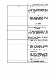 - 71 - Bearbeitungsstand: 1 1 .04.201 7 1 2:39 Uhr Entwurf Beschl üsse des 6. Ausschusses § 55b der Verwaltungsgerichtsord- nung, die zuletzt durch Artikel 20 d i eses Gesetzes geändert worden ist, wird wie folgt geändert: 1. Absatz 1 wird aufgehoben. ' 2. Absatz 1 a wird Absatz 1 u n d in Satz 1 werden die Wörter "a b dem 1 . Januar 2026" gestrichen. Artikel 22 Änderu ng der Finanzgerichts- ord n u ng ' Die Finanzgerichtsordnung i n der Fassung der Bekanntmachung vom 28. März 2001 (BGBI. I s. 442, 2262; 2002 I S. 679), die zuletzt durch Art i kel 8 des Gesetzes vom 1 1 . Oktober 201 6 .· · (BGBI. I S. 2222) geändert worden ist, wird wie folgt geändert: 1. l n § 47 Absatz 2 Satz 1 werd e n die Wörter "zur Niederschrift" durc h die Wörter "zu Protokoll" ersetzt. 2. l n § 50 Absatz 2 Satz 1 werd e n die Wörter "zur N iederschrift" durch die Wörter "zu Protokoll" ersetzt. 3. Dem § 52a Absatz 7 wird folg ender Satz angefügt: "Der in Satz 1 genannten Form ge- n ügt auch ein elektronisches Do- kument, in welches das handschrift- lieh unterzeichnete Sch riftstück gemäß § 52b Absatz 6 Satz 4 über- tragen worden ist." · 4. § 52b wird wie folgt geändert: