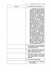 - 73 - Bearbeitungsstand: 1 1 .04.201 7 1 2:39 Uhr Entwurf Beschlüsse des 6. Ausschusses "(6) Werden die Prozessak ten elektronisch geführt, s i nd in Papierform vorliegende Schrift stücke und sonstige Unterlagen nach dem Star:td der Tech n i k zur Ersetzung der U rschrift in ein elektronisches Dokument zu übertragen. Es ist sicherzustel len, dass das elektronische Do kument m it den vorliegenden Schriftstücken und sonstigen U nterlagen bildlich und i n halt l ich überei nstimmt. Das elektro n ische · Dokument ist m it e i nem Ü bertragungsnachweis zu ver sehen, der das bei der Ü bertra gung angewandte Verfahren und die bildl iehe und inhaltl iche Ü bereinstimmung dokumentiert. Wird ein von den· verantworten den Personen handschriftlich unterzeichnetes gerichtli.ches Sch riftstUck übertragen, ist der Ü bertragungsnachweis m it ei ner qualifizierten elektronischen Signatur des U rkundsbea'mten der Geschäftsstel le zu verse hen. Die in Papierform vorl ie genden Schriftstücke und sons tigen Unterlagen können �echs Monate nach der Ü bertra g ung vernichtet werden, sofern sie n icht rückgabepfl ichtig sind." 5. l n § 64 Absatz 1 werden die Wörter "zur Niederschrift" durch die Wörter "zu P rotokoll" ers�tzt. 6. l n § 71 Absatz 1 Satz 2 werden die Wörter "zur N iederschrift" durch die Wörter "zu Protokoll " ersetzt. 7. l n § 77 Absatz 2 Satz 1 werden nach dem Wort "Urkunden" die Wörter "oder elektronischen Dokumente" eingefügt. 8. § 78 wird wie folgt geändert: a) Dem Absat� 1 wird folgender Satz ang�fügt: