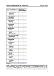 LANDTAG NORDRHEIN-WESTFALEN - 16. Wahlperiode Drucksache 16/5046 Kreis/ Ort/Schulform unbesetzte Schulleitungen Bad Münstereifel 1 Euskirchen 1 Nettersheim 1 Sekundarschule 1 Mechernich 1 Kreis Heinsberg 9 Förderschule 2 Heinsberg 1 Übach-Palenberg 1 Grundschule 2 Heinsberg 1 Wegberg 1 Hauptschule 4 Gangelt 1 Heinsberg 1 Selfkant 1 Übach-Palenberg 1 Weiterbildungskolleg 1 Geilenkirchen 1 Städteregion Aachen 14 Förderschule 1 Aachen 1 Grundschule 7 Aachen 1 Alsdorf 1 Baesweiler 1 Eschweiler 2 Stolberg 1 Würselen 1 Gymnasium 2 Aachen 2 Hauptschule 2 Monschau 1 Stolberg 1 Sekundarschule 2 Simmerath 1 Stolberg 1 Gesamt 41 Da die Zuordnung nicht auf Regierungsbezirke, sondern auf bestimmte Kommunen im Re- gierungsbezirk Köln bezogen ist, müssen die Zahlen aus dem Schulinformations- und Pla- nungssystem SchIPS auf Schulebene erhoben werden. Für die Erhebung von Vakanzen für Stellvertreterinnen und Stellvertreter wären umfangreiche Programmierarbeiten erforderlich, 3