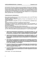 LANDTAG NORDRHEIN-WESTFALEN - 16. Wahlperiode Drucksache 16/11123 Die Welt (08.01.2016) zitiert im Rahmen eines anonymisierten Interviews einen Polizeibeam- ten, der mit den am Kölner Hauptbahnhof eingesetzten Beamten „im Austausch“ stehe. Dieser berichtet, dass die Kölner Polizeiführung auch mit Blick auf die Art der begangenen Straftaten zunächst falsche Angaben gemacht habe. Die Reaktion der eingesetzten Beamten auf die Aussagen des Kölner Polizeipräsidenten am Dienstag, es gebe bislang keinen Hinweis darauf, dass Flüchtlinge an den Taten beteiligt gewesen seien, schildert er so: „So einige Beamte dürften geschluckt haben, als sie das gehört haben.“ Vorbemerkung der Landesregierung Mit dem Bericht des Ministeriums für Inneres und Kommunales zu den von der FDP-Fraktion beantragten Tagesordnungspunkten „Aktueller Sachstand zu massiven Übergriffen auf Frauen in der Silvesternacht in Köln und anderen NRW-Städten„ „Aktueller Sachstand zu Übergriffen auf Frauen in der Silvesternacht am Bielefelder Boule- vard„ „Sachstand polizeilicher Ermittlungen und Maßnahmen gegen bekannte Tätergruppen mit arabischen bzw. nordafrikanischen Wurzeln in Köln und Düsseldorf: Ta- schendiebstähle, Antanzen, Drogenhandel oder Raubüberfälle mit Körperverletzung – Düssel- dorfer SOKO Casablanca zählt über 2.200 Tatverdächtige; Kölner Ermittler kritisieren Justiz“ wurde in der Sitzung des Innenausschusses am 21.01.2016 ausführlich berichtet (Vorlage 16/3242). Dieser Bericht ergänzt den Bericht des Ministeriums für Inneres und Kommunales vom 10.01.2016 für die Sonder-Innenausschusssitzung vom 11.01.2016 (Vorlage 16/3642). 1. Liegen dem Innenministerium Informationen vor, aus denen hervorgeht, ob – und wenn ja welche – Personen innerhalb der Kölner Polizeibehörde das Verschweigen der Herkunft der mutmaßlichen Täter im offiziellen WE-Bericht veranlasst haben? 2. Liegen dem Innenministerium Informationen vor, aus denen hervorgeht, ob – und wenn ja welche – Personen innerhalb der Kölner Polizeibehörde veranlasst haben, die begangenen Sexualstraftaten zunächst als Bestandteil von Trickdiebstählen zu relativieren? 3. Haben Stellen der Landesregierung, insbesondere des zuständigen Innenministeri- ums, die Kölner Polizeiführung im Vorfeld oder kurz nach den Übergriffen am Sil- vesterabend dazu angehalten, Informationen, die eine Beteiligung von Flüchtlingen an den Taten nahelegen, zu verschweigen? 4. Ab welchem Zeitpunkt (Tag und ungefähre Uhrzeit) lagen dem Innenminister Infor- mationen zum tatsächlichen Charakter der am Silvesterabend am Kölner Haupt- bahnhof be-gangenen Straftaten vor? 5. Ab welchem Zeitpunkt (Tag und ungefähre Uhrzeit) lagen dem Innenminister Infor- mationen zur Herkunft der am Silvesterabend am Kölner Hauptbahnhof kontrollier- ten Personen vor? Zu den Fragen 1. bis 5. siehe Vorbemerkungen 2