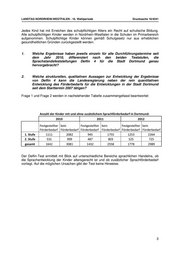 LANDTAG NORDRHEIN-WESTFALEN - 16. Wahlperiode Drucksache 16/4241 Jedes Kind hat mit Erreichen des schulpflichtigen Alters ein Recht auf schulische Bildung. Alle schulpflichtigen Kinder werden in Nordrhein-Westfalen in die Schulen im Primarbereich aufgenommen. Schulpflichtige Kinder können gemäß Schulgesetz nur aus erheblichen gesundheitlichen Gründen zurückgestellt werden. 1. Welche Ergebnisse haben jeweils einzeln für alle Durchführungstermine seit dem Jahr 2010, differenziert nach den beiden Teststufen, die Sprachstandsfeststellungen Delfin 4 für die Stadt Dortmund genau hervorgebracht? 2. Welche strukturellen, qualitativen Aussagen zur Entwicklung der Ergebnisse von Delfin 4 kann die Landesregierung neben der rein quantitativen Entwicklung des Förderbedarfs für die Entwicklungen in der Stadt Dortmund seit dem Starttermin 2007 tätigen? Frage 1 und Frage 2 werden in nachstehender Tabelle zusammengefasst beantwortet: Anzahl der Kinder mit und ohne zusätzlichem Sprachförderbedarf in Dortmund: 2010 2011 2012 Festgestellter kein Festgestellter kein Festgestellter kein Förderbedarf Förderbedarf Förderbedarf Förderbedarf Förderbedarf Förderbedarf 1. Stufe 1111 2082 945 1755 1253 2264 2. Stufe 531 999 487 803 525 725 gesamt 1642 3081 1432 2558 1778 2989 Der Delfin-Test ermittelt mit Blick auf unterschiedliche Bereiche sprachlichen Handelns, ob die Sprachentwicklung der Kinder altersgerecht ist und ob zusätzlicher Sprachförderbedarf vorliegt. Auf die möglichen Ursachen gibt der Test keine Hinweise. 3