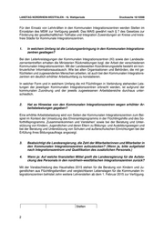 LANDTAG NORDRHEIN-WESTFALEN - 16. Wahlperiode Drucksache 16/10598 Für den Einsatz von Lehrkräften in den Kommunalen Integrationszentren werden Stellen im Einzelplan des MSW zur Verfügung gestellt. Das MAIS gewährt nach § 7 des Gesetzes zur Förderung der gesellschaftlichen Teilhabe und Integration Zuwendungen an Kreise und kreis- freie Städte für Kommunale Integrationszentren. 1. In welchem Umfang ist die Leistungserbringung in den Kommunalen Integrations- zentren gestiegen? Bei den Leiterkreistagungen der Kommunalen Integrationszentren (KI) sowie den Landesde- zernententreffen erhalten die Ministerien Rückmeldungen bzgl. der Arbeit der verschiedenen Kommunalen Integrationszentren. Mit der Landesweiten Koordinierungsstelle besteht ein kon- tinuierlicher Informationsaustausch. Wie bei allen Organisationen und Behörden, die mit ge- flüchteten und zugewanderten Menschen arbeiten, ist auch bei den Kommunalen Integrations- zentren ein deutlich erhöhter Arbeitsumfang zu konstatieren. In welcher Form und in welchem Umfang die mit Flüchtlingen in Verbindung stehenden Leis- tungen der jeweiligen Kommunalen Integrationszentren erbracht werden, ist aufgrund der kommunalen Zuordnung und der jeweils zugewiesenen Arbeitsbereiche durchaus unter- schiedlich. 2. Hat es Hinweise von den Kommunalen Integrationszentren wegen erhöhter Ar- beitsbelastungen gegeben? Eine erhöhte Arbeitsbelastung wird von Seiten der Kommunalen Integrationszentren zum Bei- spiel im Kontext der Umsetzung des Ehrenamtsprogramms in der Flüchtlingshilfe und des So- forthilfeprogramms ‚Zusammenkommen und Verstehen‘ sowie bei der Beratung und Unter- stützung von Kindern, Jugendlichen und deren Eltern zu Bildungs- und Ausbildungswegen und bei der Beratung und Unterstützung von Schulen und außerschulischen Einrichtungen bei der Erfüllung ihres Bildungsauftrags angezeigt. 3. Beabsichtigt die Landesregierung, die Zahl der Mitarbeiterinnen und Mitarbeiter in den Kommunalen Integrationszentren aufzustocken? (Wenn ja, bitte aufgelistet nach Integrationszentrum und Qualifikation des zusätzlichen Personals.) 4. Wenn ja: Auf welche finanziellen Mittel greift die Landesregierung für die Aufsto- ckung des Personals in den nordrhein-westfälischen Integrationszentren zurück? Mit der Verabschiedung des Haushaltes 2015 stehen für die Beratung von Kindern und Ju- gendlichen aus Flüchtlingsfamilien und vergleichbaren Lebenslagen für die Kommunalen In- tegrationszentren befristet zehn weitere Lehrerstellen ab dem 1. Februar 2015 zur Verfügung. Stellen 2