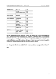 LANDTAG NORDRHEIN-WESTFALEN - 16. Wahlperiode Drucksache 16/10598 BR Arnsberg: Bochum 1,00 Herne 0,50 Ennepe-Ruhr-Kreis 0,50 BR Detmold: Bielefeld 0,50 BR Düsseldorf: Düsseldorf 1,00 Essen 1,00 Krefeld 0,50 Kreis Mettmann 0,50 Mülheim 0,50 Rhein-Kreis-Neuss 0,50 Wuppertal 0,50 BR Köln: Aachen (Stadt) 1,00 Kreis Düren 0,50 Köln 1,50 Mit der Verabschiedung des Haushalts 2016 in der Fassung der Ergänzungsvorlage vom 12.11.2015 (Drucksache 16/10150) wird dem Bedarf an zusätzlichen Mitteln für die befristete Personalaufstockung in den Kommunalen Integrationszentren, die in Zusammenhang mit der Umsetzung des vom MAIS geförderten Programms KOMM-AN- NRW stehen, Rechnung ge- tragen. Diese Mittel sind in den Ansätzen bei Kapitel 11 060 Titel 63368 enthalten. Detaillierte Angaben zur Umsetzung können derzeit noch nicht gemacht werden. 5. Tragen der Bund oder die EU Anteile an den zusätzlich bereitgestellten Mitteln? Nein. 3
