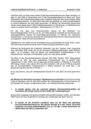 LANDTAG NORDRHEIN-WESTFALEN Drucksache 17/5922 17. Wahlperiode 29.04.2019 Antwort der Landesregierung auf die Kleine Anfrage 2196 vom 25. März 2019 der Abgeordneten Johannes Remmel, Wibke Brems und Horst Becker BÜNDNIS 90/DIE GRÜNEN Drucksache 17/5544 Restkohlebedarf für das rheinische Braunkohlekraftwerk Neurath B (Abbaugebiete Garzweiler und Hambach) Vorbemerkung der Kleinen Anfrage Die „Kommission Wachstum, Struktur und Beschäftigung“ (sog. „Kohlekommission“) hat in einem Abwägungsprozess unter Beteiligung eines breiten Spektrums gesellschaftlicher Organisationen am 26. Januar 2019 den Einstieg in den Ausstieg aus der Kohleverstromung in der Bundesrepublik Deutschland vorgeschlagen und dabei eine fast einstimmige Kompromisslösung gefunden. Diese sieht vor, dass die Leistung der Ende 2020 noch im Markt befindlichen 18,1 GW Braunkohlekraftwerke (Seite 22 Kommissionsbericht) bis 2022 auf rund 15 GW reduziert werden sollen (Seite 62 Kommissionsbericht). In der Kommission gab es eine Verständigung, dass die Abschaltungen der Kraftwerke bis 2022 im Rheinischen Revier erfolgen sollen. Im Gegenzug dafür gab es auf intensives Drängen der NRW-Landesregierung die Zusage, dass es bei den geplanten 40 Mrd. € Strukturhilfen (davon laut Äußerungen des Ministerpräsidenten 15 Mrd. € für NRW) für das Revier mit frühzeitigeren Abschaltungen auch frühzeitig einen größeren Anteil am Plafond der Strukturhilfen geben soll (Seite 104 Kommissionsbericht). Damit müssten bis 2022 Braunkohle Kraftwerksblöcke mit einer Leistung von rd. 3,1 GW im rheinischen Revier aus dem Markt genommen werden. Davon völlig unabhängig, und in den Berechnungen der Kommission berücksichtigt, sind die 2,7 GW Braunkohle, die zwischen dem 1.10.2016 und dem 1.10.2019 in Deutschland aus dem Markt genommen werden und für jeweils 4 Jahre vor ihrer endgültigen Stilllegung in die Sicherheitsbereitschaft gehen. Die beiden Blöcke Neurath C mit 300 MW und Jänschwalde E mit 500 MW sind die letzten Kraftwerksblöcke, die am 30.9.2023 aus der Sicherheitsbereitschaft ausscheiden (Seiten 24 und 25 des Kommissionsberichtes). Datum des Originals: 26.04.2019/Ausgegeben: 03.05.2019 Die Veröffentlichungen des Landtags Nordrhein-Westfalen sind einzeln gegen eine Schutzgebühr beim Archiv des Landtags Nordrhein-Westfalen, 40002 Düsseldorf, Postfach 10 11 43, Telefon (0211) 884 - 2439, zu beziehen. Der kostenfreie Abruf ist auch möglich über das Internet-Angebot des Landtags Nordrhein-Westfalen unter www.landtag.nrw.de