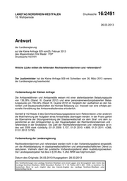 LANDTAG NORDRHEIN-WESTFALEN Drucksache 16/2491 16. Wahlperiode 26.03.2013 Antwort der Landesregierung auf die Kleine Anfrage 929 vom25. Februar 2013 des Abgeordneten Dirk Wedel FDP Drucksache 16/2191 Welche Lücke reißen die fehlenden Rechtsreferendarinnen und -referendare? Der Justizminister hat die Kleine Anfrage 929 mit Schreiben vom 26. März 2013 namens der Landesregierung beantwortet. Vorbemerkung der Kleinen Anfrage Die Amtsanwältinnen und Amtsanwälte weisen mit einer stellenbasierten Belastungsquote von 136,28% (Stand: III. Quartal 2012) und einer personalverwendungsbasierten Belas- tungsquote von 156,64% (Stand: III. Quartal 2012) im Vergleich der Laufbahnen an den Ge- richten und Staatsanwaltschaften die höchste Belastung auf. Insoweit war eine erfolgte per- sonelle Verstärkung des Amtsanwaltsdienstes erforderlich. Gemäß § 142 Absatz 3 des Gerichtsverfassungsgesetzes kann Referendaren unter anderem die Wahrnehmung der Aufgaben eines Amtsanwalts übertragen werden. In der Praxis gehört die Übernahme der Sitzungsvertretung der Staatsanwaltschaft vor dem Straf- und dem Ju- gendrichter an den Amtsgerichten zu den Hauptaufgaben der Rechtsreferendarinnen und - referendare in der Strafstation. Die Zahl der Rechtsreferendarinnen und -referendare ist in- des seit 2009 stark rückläufig (01.01.2009: 5.137, 01.01.2010: 4.689, 01.01.2011: 4.366, 01.01.2012: 3.790). Vorbemerkung der Landesregierung Rechtsreferendarinnen und -referendare werden nicht in den Vorbereitungsdienst eingestellt, um die Arbeitsbelastung im staatsanwaltschaftlichen und amtsanwaltschaftlichen Dienst zu reduzieren. Vielmehr dient der juristische Vorbereitungsdienst allein Ausbildungszwecken. Der Landesgesetzgeber hat dies in § 39 Abs. 5 JAG NRW wie folgt formuliert: Datum des Originals: 26.03.2013/Ausgegeben: 28.03.2013 Die Veröffentlichungen des Landtags Nordrhein-Westfalen sind einzeln gegen eine Schutzgebühr beim Archiv des Landtags Nordrhein-Westfalen, 40002 Düsseldorf, Postfach 10 11 43, Telefon (0211) 884 - 2439, zu beziehen. Der kostenfreie Abruf ist auch möglich über das Internet-Angebot des Landtags Nordrhein-Westfalen unter www.landtag.nrw.de