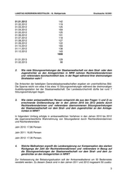 LANDTAG NORDRHEIN-WESTFALEN - 16. Wahlperiode Drucksache 16/2491 01.01.2012 142 01.02.2012 119 01.03.2012 125 01.04.2012 164 01.05.2012 125 01.06.2012 101 01.07.2012 118 01.08.2012 127 01.09.2012 122 01.10.2012 184 01.11.2012 138 01.12.2012 143 1608 01.01.2013 129 01.02.2013 98 2. Wie viele Sitzungsvertretungen der Staatsanwaltschaft vor dem Straf- oder dem Jugendrichter an den Amtsgerichten in NRW nehmen Rechtsreferendarinnen und -referendare durchschnittlich bzw. in der Regel während ihrer dreimonatigen Strafstation wahr? Die Antworten der beteiligten Generalstaatsanwaltschaften ergeben ein uneinheitliches Bild. Die Spanne reicht von etwa 4 bis etwa 10 Sitzungsvertretungen während der dreimonatigen Ausbildungsstation bei der Staatsanwaltschaft. Der Landesdurchschnitt dürfte bei rund 7 Sitzungsvertretungen liegen. 3. Wie vielen amtsanwaltlichen Pensen entspricht die aus den Fragen 1) und 2) zu errechnende Größenordnung der in den Jahren 2010 bis 2012 jeweils durch Rechtsreferendarinnen und -referendare übernommenen Sitzungsvertretungen der Staatsanwaltschaft vor dem Straf- und dem Jugendrichter an den Amtsge- richten in NRW? In folgendem Umfang erfolgte in amtsanwaltlichen Verfahren in den Jahren 2010 bis 2012 die eigenverantwortliche Wahrnehmung von Sitzungsdienst durch Rechtsreferendarinnen und Rechtsreferendare: Jahr 2010: 17,86 Pensen Jahr 2011: 16,65 Pensen Jahr 2012: 17,36 Pensen. 4. Welche Maßnahmen ergreift die Landesregierung zur Kompensation des starken Rückgangs der Zahl der Rechtsreferendarinnen und -referendare in Bezug auf die Sitzungsvertretungen der Staatsanwaltschaft vor dem Straf- und dem Ju- gendrichter an den Amtsgerichten in NRW? Zur Verbesserung der Belastungssituation soll der Amtsanwaltsdienst um 50 Bedienstete verstärkt werden. Zu diesem Zweck sind in den Jahren 2011 und 2012 insgesamt 50 zusätz- 3