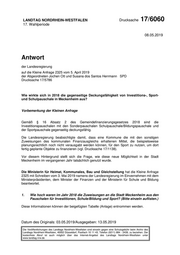 LANDTAG NORDRHEIN-WESTFALEN Drucksache 17/6060 17. Wahlperiode 08.05.2019 Antwort der Landesregierung auf die Kleine Anfrage 2325 vom 5. April 2019 der Abgeordneten Jochen Ott und Susana dos Santos Herrmann SPD Drucksache 17/5786 Wie wirkte sich in 2018 die gegenseitige Deckungsfähigkeit von Investitions-, Sport- und Schulpauschale in Meckenheim aus? Vorbemerkung der Kleinen Anfrage Gemäß § 16 Absatz 2 des Gemeindefinanzierungsgesetzes 2018 sind die Investitionspauschalen mit den Sonderpauschalen Schulpauschale/Bildungspauschale und der Sportpauschale gegenseitig deckungsfähig. Die Landesregierung beabsichtigte damit, dass eine Kommune die mit den sonstigen Zuweisungen des kommunalen Finanzausgleichs erhaltenen Mittel, die beispielsweise planungsrechtlich noch nicht verausgabt werden können, für den Sport zu nutzen, um dort fertig geplante Objekte zu finanzieren (vgl. Drucksache 17/1138). Vor diesem Hintergrund stellt sich die Frage, wie diese neue Möglichkeit in der Stadt Meckenheim im vergangenen Jahr tatsächlich genutzt wurde. Die Ministerin für Heimat, Kommunales, Bau und Gleichstellung hat die Kleine Anfrage 2325 mit Schreiben vom 3. Mai 2019 namens der Landesregierung im Einvernehmen mit dem Ministerpräsidenten, dem Minister der Finanzen und der Ministerin für Schule und Bildung beantwortet. 1. Wie hoch waren im Jahr 2018 die Zuweisungen an die Stadt Meckenheim aus den Pauschalen für Investitionen, Schule/Bildung und Sport? (Bitte einzeln auflisten.) Diese Informationen können der beigefügten Tabelle (Anlage) entnommen werden. Datum des Originals: 03.05.2019/Ausgegeben: 13.05.2019 Die Veröffentlichungen des Landtags Nordrhein-Westfalen sind einzeln gegen eine Schutzgebühr beim Archiv des Landtags Nordrhein-Westfalen, 40002 Düsseldorf, Postfach 10 11 43, Telefon (0211) 884 - 2439, zu beziehen. Der kostenfreie Abruf ist auch möglich über das Internet-Angebot des Landtags Nordrhein-Westfalen unter www.landtag.nrw.de