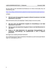 LANDTAG NORDRHEIN-WESTFALEN - 17. Wahlperiode Drucksache 17/6060 Sie sind zudem auf der Internetseite des Ministeriums für Heimat, Kommunales, Bau und Gleichstellung unter https://www.mhkbg.nrw/themen/kommunales/kommunale-finanzen/kommunale-finanzierung verfügbar. 2. Wie hoch waren die tatsächlichen Ausgaben im Bereich Investitionen in der Stadt Meckenheim im Jahr 2018? Diese Informationen können der beigefügten Tabelle (Anlage) entnommen werden. 3. Wie hoch waren die tatsächlichen Ausgaben für Schule/Bildung in der Stadt Meckenheim im Jahr 2018? 4. Wie hoch waren die tatsächlichen Ausgaben für Sport in der Stadt Meckenheim im Jahr 2018? 5. Wurde in der Stadt Meckenheim die gegenseitige Deckungsfähigkeit von Investitions-, Schul-/Bildungs- und Sportpauschale in 2018 in Anspruch genommen? Die Fragen 3 bis 5 werden gemeinsam beantwortet. Die zur Beantwortung der Fragen erforderlichen Informationen aus dem kommunalen Bereich liegen der Landesregierung nicht vor. 2