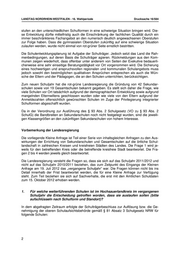 LANDTAG NORDRHEIN-WESTFALEN - 16. Wahlperiode Drucksache 16/584 Schulträger Schulform Schulname Olsberg Hauptschule Gem. Hauptschule Olsberg* Olsberg Realschule Städt. Realschule* Arnsberg Hauptschule Gem. Hauptschule Oeventrop Winterberg Hauptschule Gem. Hauptschule Schule am Kahlen Asten * = nach den vorliegenden Informationen schulorganisatorische Maßnahme im Zusammen- hang mit der Errichtung einer Sekundar- oder Gesamtschule 2. Bei welchen dieser Schulen war aufgrund der schulrechtlichen Vorgaben die Schließung unumgänglich (bitte aufgrund der schulrechtlichen Vorgaben nach Standorten und entsprechenden Zahlen aufschlüsseln)? 3. Für welche Schulen ist der Beschluss zum Auslaufen der Schule gefasst worden, ohne dass ein solches Auslaufen aufgrund schulrechtlicher Vorgaben notwendig gewesen wäre (bitte nach Schule, Schulform und Standort aufschlüsseln)? Über die Errichtung, Änderung und Auflösung öffentlicher Schulen entscheiden die Schulträ- ger in eigener Zuständigkeit im Rahmen ihrer verfassungsrechtlich garantierten Selbstver- waltung und der schulrechtlichen Vorgaben in §§ 78 ff. des Schulgesetzes. Dies bedeutet, dass eine Schule aufzulösen ist, wenn sie die Mindestgröße nicht mehr erreicht (§ 82 SchulG in Verbindung mit § 6 der Verordnung zur Ausführung des § 93 Absatz 2 SchulG) und auch dann aufgelöst werden darf, wenn sie die Mindestgröße überschreitet und der Schulträger sich an die Vorgaben in § 80 SchulG hält. 4. Welche Größen werden nach dem Abschluss des Anmeldeverfahrens die Klas- sen an Sekundarschulen jeweils umfassen (bitte, wenn eine Sekundarschule entsteht, nach Standort und Klassengröße der jeweiligen Eingangsklassen auf- schlüsseln)? Die Klassengrößen werden erst feststehen, wenn die Schulen nach den Sommerferien ihren Betrieb aufgenommen haben werden. Die erbetenen Daten werden im Rahmen der Schul- statistik zum Stichtag 15. Oktober 2012 erhoben und werden dem Ministerium für Schule und Weiterbildung frühestens im Januar 2013 vorliegen. 3