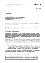 LANDTAG NORDRHEIN-WESTFALEN Drucksache 16/10775 16. Wahlperiode 19.01.2016 Antwort der Landesregierung auf die Kleine Anfrage 4151 vom 18. Dezember 2015 des Abgeordneten Nicolaus Kern PIRATEN Drucksache 16/10538 Stand der Dinge – wie sieht es mit der Personalsituation im allgemeinen Vollzugsdienst der Justizvollzugsanstalten aus? Der Justizminister hat die Kleine Anfrage 4151 mit Schreiben vom 18. Januar 2016 namens der Landesregierung beantwortet. Vorbemerkung der Kleinen Anfrage Der allgemeine Vollzugsdienst ist in den Justizvollzugsanstalten des Landes Nordrhein- Westfalen für die Beaufsichtigung, Versorgung und Betreuung der Gefangenen zuständig. Die Beamtinnen und Beamten, welche diese verantwortungs- und anspruchsvolle Tätigkeit ausüben, sind im Schichtdienst tätig. Ihre Tätigkeit ist ausschlaggebend für den reibungslosen Betrieb innerhalb der JVA. Wie alle Berufe, so ist auch dieses Berufsfeld von den allgemeinen Entwicklungen innerhalb unserer Gesellschaft betroffen. Diese sind beispielsweise die demografische Entwicklung, aber auch die erhöhte Arbeitsverdichtung und Belastung durch Überstunden. Umso wichtiger ist es daher, im Bereich des Justizvollzugsdienstes über eine ausreichende Personaldecke zu verfügen. 1. Wie entwickelt sich die Anzahl der Auszubildenden für den allgemeinen Justizvollzugsdienst (bitte tabellarisch aufschlüsseln: Anzahl der vorhandenen Ausbildungsplätze, der vorhandenen Auszubildenden, sowie die Anzahl der Übernahmen nach der Ausbildung, jeweils für die Jahre von 2013 bis 2015)? Die Zahl der nach Ablegung der Prüfung übernommen Anwärterinnen und Anwärter des allgemeinen Vollzugsdienstes in den Jahren 2013 - 2015 stellt sich wie folgt dar: Datum des Originals: 18.01.2016/Ausgegeben: 22.01.2016 Die Veröffentlichungen des Landtags Nordrhein-Westfalen sind einzeln gegen eine Schutzgebühr beim Archiv des Landtags Nordrhein-Westfalen, 40002 Düsseldorf, Postfach 10 11 43, Telefon (0211) 884 - 2439, zu beziehen. Der kostenfreie Abruf ist auch möglich über das Internet-Angebot des Landtags Nordrhein-Westfalen unter www.landtag.nrw.de