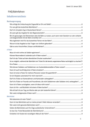 Stand: 15. Januar 2021 Was passiert mit meinen Daten auf dem „Sondereinstieg“? ...................................................................................... 14 Reservistendienst Leistende (RDL) Wann kann ich als RDL den eToken nutzen?................................................................................................................. 14 Reicht eine Einladung zur Dienstlichen Veranstaltung (DVAG) und die Uniformtrageerlaubnis aus? ............. 14 Reicht der Ausweis für Reservisten und Reservistinnen als Ausweispapier? ......................................................... 14 Ich bin Reservistendienst Leistende / Reservistendienst Leistender. Gilt das Angebot der Freifahrt für mich auch?........................................................................................................................................................................................ 14 Können beorderte zivile Mitarbeiter mit DVAG ein eToken und Bahnticket erwerben? .................................... 14 Beauftragte Personen Was ist die „Beauftragte Person“ und was ist ihre Funktion? .................................................................................... 14 Wer ist für die Erstellung der Bahntickets zuständig? ................................................................................................. 15 Wer wird wann und wo zur „Beauftragten Personen“ benannt? .............................................................................. 15 Können eToken auch im Freizeitbüro oder am Infopunkt geordert werden? ....................................................... 15 Was muss die „Beauftragte Person“ bei der Weitergabe der eToken beachten? .................................................. 15 Reiseverlauf In welcher Klasse fahren die Nutzenden kostenfrei?................................................................................................... 15 Bin ich an die Zugverbindungen gebunden? .................................................................................................................. 15 Kann ich spontan meinen Zielort ändern? ...................................................................................................................... 15 Steht mir ein Sitzplatz zu? .................................................................................................................................................. 15 Kann ich auch private Verkehrsbetriebe im öffentlichen Personennahverkehr (U-Bahnen, Busse etc.) nutzen?.................................................................................................................................................................................... 15 Wie erfolgt die Umbuchung bei Zugausfall?.................................................................................................................. 15 Wer ist mein Ansprechpartner bei Zugausfällen? ......................................................................................................... 15 Kann ich mit dem Bahnticket die DB-Lounge nutzen? ............................................................................................... 15 Bin ich über den Grund der Reise auskunftspflichtig? ................................................................................................. 15 Haftet die Bahn bei Zugausfällen für die Kosten eines 1. Klasse Upgrades?.......................................................... 15 Haftet die Bahn bei Zugausfällen für die Kosten der Sitzplatzreservierung? ......................................................... 16 Wann muss ich Platz machen? .......................................................................................................................................... 16 Habe ich Fahrgastrechte? ................................................................................................................................................... 16 Ist den Anweisungen des Personals der Deutschen Bahn Folge zu leisten? .......................................................... 16 Trennungsgeldverordnung und Reisekostenrecht Wird meine Pendlerpauschale gekürzt?.......................................................................................................................... 16 Ich bin Trennungsgeldempfänger und fahre regelmäßig am Wochenende mit meinem PKW nach Hause zu meiner Familie. Bin ich nun verpflichtet mit der Bahn zu fahren? Habe ich dadurch Nachteile? ..................... 16 Ich nutze als Trennungsgeldempfänger bereits jetzt die Bahn für meine Familienheimfahrten. Muss ich diese nun in Uniform durchführen? ................................................................................................................................. 16 Welche Rechte habe ich als Freiwillig Wehrdienst Leistende oder Leistender?.................................................... 16 4