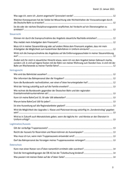 Stand: 15. Januar 2021 selbstzahlende Bahnkunde buchen kann. Es können alle Verbindungen gebucht werden, die im „Sondereinstieg“ hinterlegt, also dort buchbar sind. Ist es möglich, auf ein Bahnticket, das (z.B. aus dienstlichen Gründen) nicht genutzt werden kann, einen Rabatt auf Flexpreis-Umbuchungen zu erhalten? Nein. Wenn das Bahnticket nicht genutzt wird, verfällt es und Sie müssten sich mit einem neuen eToken ein neues Bahnticket buchen. Es gilt, dies wenn immer möglich zu vermeiden. Uniform Wer kontrolliert oder überwacht das Tragen der Uniform während der Fahrt? Kontrollen sind jederzeit durch Zugbegleiter sowie Bahnhof- oder Zugstreifen der Feldjäger möglich. Das Fahrticket gilt nur, wenn Sie in Uniform reisen und einen gültigen Truppenausweis mitführen. Allerdings sind die Zugbegleiter nicht für die Kontrolle des Anzugs zuständig. Hier hat jede Soldatin und jeder Soldat selber die Pflicht, einen vorschriftskonformen Anzug zu tragen. Wird während einer Fahrt der Anzug beschmutzt (z.B. durch Speisen oder Getränke, die versehentlich darüber geschüttet werden), sollte mit dem Zugpersonal Verbindung aufgenommen werden und nach einem Modus gefragt werden. Die Berechtigung zur Nutzung des Angebotes entfällt, sobald der Anzug nicht mehr vollständig getragen wird. Was passiert, wenn ich meine Uniform vergessen habe? Das Angebot darf dann nicht genutzt werden. Im Falle der Nutzung des Tickets ohne Tragen der Uniform handelt es sich um eine „Schwarzfahrt“. Es werden seitens der Deutschen Bahn AG Fahrpreisnacherhebungen in der derzeit gültigen Preislistenfassung erhoben. Diese beinhalten das nachzuerhebende Beförderungsentgelt sowie den Preis für das jeweilige nachzubuchende Ticket. Kann ich mich im Zug vor Ende der Fahrt in Zivil umziehen? Nein! Der Wechsel der Bekleidung nach der Kontrolle durch das Bahnpersonal, stellt einen Verstoß gegen die Nutzungsbedingungen dar und kann ggf. als Fahren ohne gültigen Fahrausweis gewertet werden. Grundsätzlich entfällt mit dem Ablegen der Uniform im Zug die Berechtigung zur Nutzung des Angebotes. In welchen Großstädten besteht ein Uniformtrageverbot? Es gibt kein generelles Uniformtrageverbot. Disziplinarvorgesetzte oder Standortälteste können in Einzelfällen örtlich oder zeitlich begrenzt ein partielles Verbot erteilen. Bitte erkundigen Sie sich in Zweifelsfällen vor Fahrtantritt im Büro des jeweiligen Standortältesten bzw. Kasernenkommandanten. Warum ist das Bahnfahren an das Tragen der Uniform gekoppelt? Ziel der Maßnahme ist es, die Sichtbarkeit von Soldatinnen und Soldaten der Bundeswehr in der Öffentlichkeit zu erhöhen. Ist das Tragen der Uniform in der Freizeit zum Zwecke der Nutzung des kostenfreien Angebots nicht in Wahrheit Dienst? Nein. Es handelt sich um ein freiwilliges Angebot für private Fahrten. Es gilt ausdrücklich, dass Bahnfahrten zu privaten Zwecken in der Freizeit stattfinden, also kein Dienst sind. Das gilt auch für die Fahrten zum und vom Dienst. Darf ich überhaupt meine Uniform für Privatfahrten nutzen? Ja! Das ist Sinn und Zweck dieser Regelung. Welcher Anzug ist für mich gültig? Es gilt die Anzugordnung für Soldatinnen und Soldaten in der gültigen Form A1-2630/0-9804, Nr. 110: Wird außer Dienst Uniform getragen, ist außerhalb umschlossener militärischer Anlagen grundsätzlich der Dienstanzug zu tragen. • Das Tragen des Feldanzuges, Tarndruck, allgemein bzw. Bord- und Gefechtsanzuges ist gestattet: • auf dem Weg vom und zum Dienst (Dienstort/Wohnort/Wochenendheimfahrt), 10