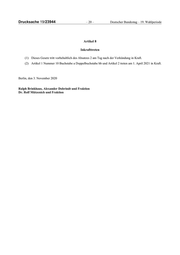 Drucksache 19/23944 – 20 – Deutscher Bundestag – 19. Wahlperiode Artikel 8 Inkrafttreten (1) Dieses Gesetz tritt vorbehaltlich des Absatzes 2 am Tag nach der Verkündung in Kraft. (2) Artikel 1 Nummer 10 Buchstabe a Doppelbuchstabe bb und Artikel 2 treten am 1. April 2021 in Kraft. Berlin, den 3. November 2020 Ralph Brinkhaus, Alexander Dobrindt und Fraktion Dr. Rolf Mützenich und Fraktion