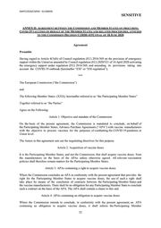 SANTE/2020/C3/043 - 512.838335 SENSITIVE ANNEX II: AGREEMENT BETWEEN THE COMMISSION AND MEMBER STATES ON PROCURING Covrn-19 VACCINES ON BEHALF OF THE MEMBER STATES AND RELATED PROCEDURES. ANNEXED TO THE COMMISSION DECISION C(202Q) 4192 FINAL OF 18 ,JUNE 2020 Agreement Preamble Having regard to Article 4( 5)(b) of Council regulation (EU) 2016/369 on the provision of emergency support within the Unionlas amended by Council regulation (EU) 2020/521 of 14 April 2020 activating the emergency support under regulation (EU) 2016/369, and amending its provisions taking into account the COVID-19 outbreak (hereinafter "ESI" or "ESI regulation"); *** The European Commission ("the Commission") and The following Member States: (XXX), hereinafter referred to as "the Participating Member States" Together referred to as "the Parties" Agree on the Following: Article 1: Objective and mandate of the Commission On the basis of the present agreement, the Commission is mandated to conclude, on behalf of the Participating Member States, Advance Purchase Agreements ("APA") with vaccine manufacturers with the objective to procure vaccines for the purposes of combatting the COVID 19 pandemic at Union level. The Annex to this agreement sets out the negotiating directives for this purpose. Article 2: Acquisition of vaccine doses It is the Participating Member States, and not the Commission, that shall acquire vaccine doses from the manufacturers on the basis of the APAs unless otherwise agreed. All relevant vaccination policies shall therefore remain matters for the Participating Member States. Article 3: AP As containing a right to acquire vaccine doses Where the Commission concludes an APA in conformity with the present agreement that provides the right for the Participating Member States to acquire vaccine doses, the use of such a right shall take place by means of the conclusion of contracts between the Participating Member States and the vaccine manufacturers. There shall be no obligation for any Participating Member State to conclude such a contract on the basis of the APA. The APA shall contain a clause to this end. Article 4: AP As containing an obligation to acquire vaccine doses Where the Commission intends to conclude, in conformity with the present agreement, an APA containing an obligation to acquire vaccine doses, it shall inform the Participating Member 52