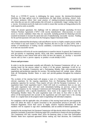 SANTE/2020/C3/043 - 512.838335 SENSITIVE Work on a COVID-19 vaccine is challenging for many reasons: the shortened development timeframe, the large upfront costs for manufacturers, the high failure rate during clinical trials. If vaccine producers follow their usual practice of making investments in production capacity only when they are sure of a viable product, this will result in considerably longer waiting times for a vaccine. Investments need to be made now in order to ensure that vaccines are being produced at the scale required as early as possible. Under the present agreement, this challenge will be addressed through concluding EU-level Advance Purchase Agreements ("APA") with vaccine manufacturers when necessary, to secure access to vaccine candidates where they are successful, including up-front EU financing to de-risk essential investments to increase the speed and scale of manufacturing successful vaccines. Funding for the up-front payments will come from the Emergency Support Instrument (ESI). The Parties understand that developing a safe and effective vaccine is a highly complex process and the risk of failure in any such venture is very high. Therefore, the aim is to put in place AP As with a number of manufacturers of leading vaccine candidates, to maximise the chances of having access to at least one successful vaccine. The Commission will invite all vaccine manufacturers to manifest interest. In general, the Commission will give priority to negotiating specific APAs with those manufacturers that (a) have entered or have firm plans to enter clinical trials still in 2020, (b) have the capacity to develop a successful vaccine and (c) have a proven capacity to produce at scale already in 2021. Process and governance In order to run the procurement centrally and efficiently, the European Commission will set up a steering board for the process subject to Article 6 of the present Agreement. It will be co- chaired by the European Commission and a Participating Member State with experience in the negotiations and production capacities for vaccines. The steering board will include senior officials from all Participating Member States to assist and provide guidance throughout the evaluation process. The co-chairs of the steering board will propose a team of a limited number of experts with relevant experience for the ongoing negotiations from six Participating Member States with production capacities for vaccines. These experts will join with the European Commission in a negotiation team ('joint negotiation team"), which will work on a continuous basis as one unit. That joint negotiation team will start work immediately building on previous contacts with individual companies by the European Commission and Participating Member States. In order to launch negotiations with a specific manufacturer, there needs to be support from at least four Participating Member States. The joint negotiation team will make its best effort to take the advice of the steering board into account in the negotiations and will report back to the steering board on a regular basis on the progress made in negotiating with individual companies. For compliance with the applicable rules, all members of the steering board and the joint negotiation team will obtain the status of experts associated to the procurement process as provided in the Financial Regulation. Given their access to highly sensitive business information, all those members will be required to sign strict confidentiality and no-conflict-of-interest agreements. Assisted by the steering board, the European Commission will then decide which of the resulting AP As should be concluded, in particular if financing under ESI is insufficient to finance all relevant packages. The Commission will only consider those APAs for financing where at least four Participation Member States have expressed agreement. Before making any final decisions, the Commission 54