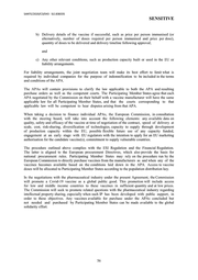 SANTE/2020/C3/043 - 512.838335 SENSITIVE States of such intention and the detailed terms. In case a Participating Member State does not agree with the conclusion of an APA containing an obligation to acquire vaccine doses or its terms, it has the right to opt out by explicit notification to the Commission within 5 working days after the Commission has communicated its intention to conclude the APA. All Participating Member States not having opted out within the period of 5 working days are deemed to have authorised the Commission to negotiate and conclude the APA with the vaccine manufacturer in their name and on their behalf. Article 5: The legally binding nature of APAs Once concluded, the terms of the APA shall be legally binding on the Participating Member States, except for those who have exercised their right to opt out. Article 6: Responsibility and liability The present Agreement regulates only the division of potential liability and indemnification between the Commission and the Participating Member States. It does not regulate the extent to or the conditions under which potential liability of the vaccine manufacturer may be taken over or indemnified under the APAs. The Commission shall be exclusively responsible for the procurement process and the conclusion of APAs including any liability arising out of the conduct of the negotiations. Participating Member States acquiring a vaccine shall be responsible for the deployment and use of the vaccines under their national vaccination strategies, and shall bear any liability associated with such use and deployment. This shall extend to and include any indemnification of vaccine manufacturers under the terms and conditions of the relevant APA for liability related to the use and deployment of vaccines normally borne by such manufacturer. Article 7: Obligation not to negotiate separately By signing the present Agreement, the Participating Member States confirm their participation in the procedure and agree not to launch their own procedures for advance purchase of that vaccine with the same manufacturers. In case an APA containing an obligation to acquire vaccine doses has been concluded with a specific manufacturer, the Member States having made use of the opt-out provided under the present Agreement can enter into separate negotiations with the same manufacturer after the APA under the present Agreement has been signed. Annex Initial considerations A permanent solution to the COVID-19 cns1s is most likely to be brought about by the development and deployment of a safe and effective vaccine against the virus. Every month gained in the deployment of a vaccine will save many lives, many jobs and billions of euros. Therefore, it is the objective of the present Agreement that the EU takes steps to secure sufficient supplies of a safe and effective vaccine for Member States. Structure and purpose of the procurement 53