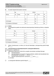 EVB-IT Systemvertrag Seite 25 von 44 Vertragsnummer/Kennung Auftraggeber _______ Vertragsnummer/Kennung Auftragnehmer _______ Es werden folgende Servicezeiten vereinbart: Tag Uhrzeit Montag bis Freitag von 8:00 bis 17:00 Uhr Uhr von bis Uhr An Sonntagen von bis Uhr An Feiertagen am Erfüllungsort von bis Uhr 5.1.1.4 Hotline Der Auftragnehmer gewährt eine telefonische deutschsprachige Unterstützung (Hotline) zu folgenden Zeiten: Tag Uhrzeit bis von bis Uhr bis von bis Uhr von bis Uhr An Sonntagen von bis Uhr An Feiertagen am Erfüllungsort von bis Uhr Weitere Vereinbarungen zur Hotline (z.B. Kreis der Berechtigten, Leistungsumfang) gemäß Anlage Nr. . 5.1.2 Aufrechterhaltung der Betriebsbereitschaft* (vorbeugende Maßnahmen) Der Auftragnehmer verpflichtet sich angemessene Maßnahmen mit dem Ziel zu ergreifen, das Auftreten zukünftiger Störungen des Gesamtsystems des Gesamtsystems mit Ausnahme folgender gelieferter, erstellter oder beizustellenden Sys- temkomponenten* aus Nummer lfd. Nr. folgender Systemkomponenten* aus Nummer lfd. Nr. zu vermeiden. zu vorbeugenden Maßnahmen gemäß Anlage Nr. . Die mit * gekennzeichneten Begriffe sind am Ende der EVB-IT System-AGB definiert. Version 2.01 vom 09.01.2013
