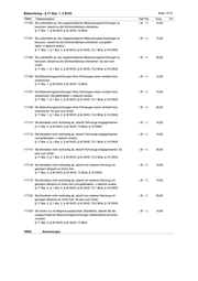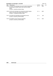 Beleuchtung - § 17 Abs. 1, 2 StVO Seite 112/ 0 TBNR Tatbestandstext FaP-Pkt Euro FV 117100 Sie unterließen es, die vorgeschriebenen Beleuchtungseinrichtungen zu ( B- 1) 10,00 benutzen, obwohl es die Sichtverhältnisse erforderten. § 17 Abs. 1, § 49 StVO; § 24 StVG; 73 BKat 117101 Sie unterließen es, die vorgeschriebenen Beleuchtungseinrichtungen zu ( B- 1) 15,00 benutzen, obwohl es die Sichtverhältnisse erforderten und gefähr- deten +) dadurch andere. § 17 Abs. 1, § 1 Abs. 2, § 49 StVO; § 24 StVG; 73.1 BKat; § 19 OWiG 117102 Sie unterließen es, die vorgeschriebenen Beleuchtungseinrichtungen zu ( B- 1) 35,00 benutzen, obwohl es die Sichtverhältnisse erforderten. Es kam zum Unfall. § 17 Abs. 1, § 1 Abs. 2, § 49 StVO; § 24 StVG; 73.2 BKat; § 19 OWiG 117106 Die Beleuchtungseinrichtungen Ihres Fahrzeuges waren verdeckt bzw. ( B- 1) 10,00 verschmutzt. § 17 Abs. 1, § 49 StVO; § 24 StVG; 73 BKat 117107 Die Beleuchtungseinrichtungen Ihres Fahrzeuges waren verdeckt bzw. ( B- 1) 15,00 verschmutzt. Sie gefährdeten +) dadurch andere. § 17 Abs. 1, § 1 Abs. 2, § 49 StVO; § 24 StVG; 73.1 BKat; § 19 OWiG 117108 Die Beleuchtungseinrichtungen Ihres Fahrzeuges waren verdeckt bzw. ( B- 1) 35,00 verschmutzt. Es kam zum Unfall. § 17 Abs. 1, § 1 Abs. 2, § 49 StVO; § 24 StVG; 73.2 BKat; § 19 OWiG 117112 Sie blendeten nicht rechtzeitig ab, obwohl Fahrzeuge entgegenkamen. ( B- 1) 10,00 § 17 Abs. 2, § 49 StVO; § 24 StVG; 73 BKat; § 19 OWiG 117113 Sie blendeten nicht rechtzeitig ab, obwohl Fahrzeuge entgegenkamen ( B- 1) 15,00 und gefährdeten +) dadurch andere. § 17 Abs. 2, § 1 Abs. 2, § 49 StVO; § 24 StVG; 73.1 BKat; § 19 OWiG 117114 Sie blendeten nicht rechtzeitig ab, obwohl Fahrzeuge entgegenkamen. Es ( B- 1) 35,00 kam zum Unfall. § 17 Abs. 2, § 1 Abs. 2, § 49 StVO; § 24 StVG; 73.2 BKat; § 19 OWiG 117118 Sie blendeten nicht rechtzeitig ab, obwohl ein anderes Fahrzeug mit ( B- 1) 10,00 geringem Abstand vor Ihnen fuhr. § 17 Abs. 2, § 49 StVO; § 24 StVG; 73 BKat; § 19 OWiG 117119 Sie blendeten nicht rechtzeitig ab, obwohl ein anderes Fahrzeug mit ( B- 1) 15,00 geringem Abstand vor Ihnen fuhr und gefährdeten +) dadurch andere. § 17 Abs. 2, § 1 Abs. 2, § 49 StVO; § 24 StVG; 73.1 BKat; § 19 OWiG 117120 Sie blendeten nicht rechtzeitig ab, obwohl ein anderes Fahrzeug mit ( B- 1) 35,00 geringem Abstand vor Ihnen fuhr. Es kam zum Unfall. § 17 Abs. 2, § 1 Abs. 2, § 49 StVO; § 24 StVG; 73.2 BKat; § 19 OWiG 117124 Sie fuhren nur mit Begrenzungsleuchten (Standlicht), obwohl Sie die ( B- 1) 10,00 vorgeschriebenen Beleuchtungseinrichtungen (Abblendlicht) benutzen mussten. § 17 Abs. 2, § 49 StVO; § 24 StVG; 74 BKat TBNR Bemerkungen