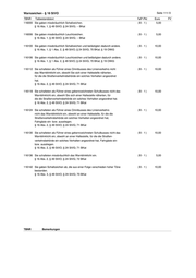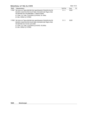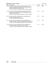 Einrichtungen zur Überwachung der Parkzeit - § 13 Abs. 1, 2 StVO Seite 107/ 0 TBNR Tatbestandstext FaP-Pkt Euro FV 113300 Sie parkten bei Zeichen 314 oder 315, ohne die durch Zusatzzeichen ( B- 1) 5,00 vorgeschriebene Parkscheibe (Bild 291) verwendet oder diese von außen gut lesbar im oder am Fahrzeug angebracht zu haben. § 13 Abs. 1, 2, § 49 StVO; § 24 StVG; 63.1 BKat Tab.: 713010 113301 Sie parkten bei Zeichen 314 oder 315, ohne die durch Zusatzzeichen ( B- 1) 10,00 vorgeschriebene Parkscheibe (Bild 291) verwendet oder diese von außen gut lesbar im oder am Fahrzeug angebracht zu haben - länger als 30 Minuten. § 13 Abs. 1, 2, § 49 StVO; § 24 StVG; 63.2 BKat Tab.: 713010 113302 Sie parkten bei Zeichen 314 oder 315, ohne die durch Zusatzzeichen ( B- 1) 15,00 vorgeschriebene Parkscheibe (Bild 291) verwendet oder diese von außen gut lesbar im oder am Fahrzeug angebracht zu haben - länger als 1 Stunde. § 13 Abs. 1, 2, § 49 StVO; § 24 StVG; 63.3 BKat Tab.: 713010 113303 Sie parkten bei Zeichen 314 oder 315, ohne die durch Zusatzzeichen ( B- 1) 20,00 vorgeschriebene Parkscheibe (Bild 291) verwendet oder diese von außen gut lesbar im oder am Fahrzeug angebracht zu haben - länger als 2 Stunden. § 13 Abs. 1, 2, § 49 StVO; § 24 StVG; 63.4 BKat Tab.: 713010 113304 Sie parkten bei Zeichen 314 oder 315, ohne die durch Zusatzzeichen ( B- 1) 25,00 vorgeschriebene Parkscheibe (Bild 291) verwendet oder diese von außen gut lesbar im oder am Fahrzeug angebracht zu haben - länger als 3 Stunden. § 13 Abs. 1, 2, § 49 StVO; § 24 StVG; 63.5 BKat Tab.: 713010 113320 Sie parkten bei Zeichen 314 oder 315, ohne die durch Zusatzzeichen ( B- 1) 5,00 vorgeschriebene Parkscheibe (Bild 291) richtig eingestellt zu haben. § 13 Abs. 1, 2, § 49 StVO; § 24 StVG; 63.1 BKat Tab.: 713011 113321 Sie parkten bei Zeichen 314 oder 315, ohne die durch Zusatzzeichen ( B- 1) 10,00 vorgeschriebene Parkscheibe (Bild 291) richtig eingestellt zu haben - länger als 30 Minuten. § 13 Abs. 1, 2, § 49 StVO; § 24 StVG; 63.2 BKat Tab.: 713011 113322 Sie parkten bei Zeichen 314 oder 315, ohne die durch Zusatzzeichen ( B- 1) 15,00 vorgeschriebene Parkscheibe (Bild 291) richtig eingestellt zu haben - länger als 1 Stunde. § 13 Abs. 1, 2, § 49 StVO; § 24 StVG; 63.3 BKat Tab.: 713011 113323 Sie parkten bei Zeichen 314 oder 315, ohne die durch Zusatzzeichen ( B- 1) 20,00 vorgeschriebene Parkscheibe (Bild 291) richtig eingestellt zu haben - länger als 2 Stunden. § 13 Abs. 1, 2, § 49 StVO; § 24 StVG; 63.4 BKat Tab.: 713011 113324 Sie parkten bei Zeichen 314 oder 315, ohne die durch Zusatzzeichen ( B- 1) 25,00 vorgeschriebene Parkscheibe (Bild 291) richtig eingestellt zu haben - länger als 3 Stunden. § 13 Abs. 1, 2, § 49 StVO; § 24 StVG; 63.5 BKat Tab.: 713011 TBNR Bemerkungen