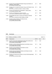 TBNR Bemerkungen 12.1.25 Besondere Verkehrslagen - § 11 StVO Seite 62 / 0 TBNR Tatbestandstext FaP-Pkt Euro FV 111100 Sie fuhren trotz stockenden Verkehrs in die Kreuzung bzw. Einmündung ein und (B - 1) 20,00 behinderten +) dadurch andere. § 11 Abs. 1, § 1 Abs. 2, § 49 StVO; § 24 StVG; 49 BKat; § 19 OWiG 111101 Sie fuhren trotz stockenden Verkehrs in die Kreuzung bzw. Einmündung ein. Es (B - 1) 35,00 kam zum Unfall. § 11 Abs. 1, § 1 Abs. 2, § 49 StVO; § 24 StVG; 49 BKat; § 19 OWiG 111106 Sie bildeten auf einer Autobahn oder Außerortsstraße keine freie Gasse zur (B - 1) 20,00 Durchfahrt von Polizei- oder Hilfsfahrzeugen, obwohl der Verkehr stockte. § 11 Abs. 2, § 49 StVO; § 24 StVG; 50 BKat