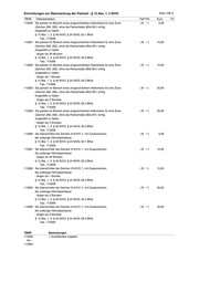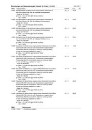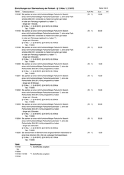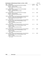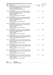 Einrichtungen zur Überwachung der Parkzeit - § 13 Abs. 1, 2 StVO Seite 106/ 0 TBNR Tatbestandstext FaP-Pkt Euro FV 113260 Sie parkten im Bereich eines eingeschränkten Haltverbots für eine Zone ( B - 1) 5,00 (Zeichen 290, 292), ohne die Parkscheibe (Bild 291) richtig eingestellt zu haben. § 13 Abs. 1, 2, § 49 StVO; § 24 StVG; 63.1 BKat Tab.: 713008 113261 Sie parkten im Bereich eines eingeschränkten Haltverbots für eine Zone ( B - 1) 10,00 (Zeichen 290, 292), ohne die Parkscheibe (Bild 291) richtig eingestellt zu haben - länger als 30 Minuten. § 13 Abs. 1, 2, § 49 StVO; § 24 StVG; 63.2 BKat Tab.: 713008 113262 Sie parkten im Bereich eines eingeschränkten Haltverbots für eine Zone ( B - 1) 15,00 (Zeichen 290, 292), ohne die Parkscheibe (Bild 291) richtig eingestellt zu haben - länger als 1 Stunde. § 13 Abs. 1, 2, § 49 StVO; § 24 StVG; 63.3 BKat Tab.: 713008 113263 Sie parkten im Bereich eines eingeschränkten Haltverbots für eine Zone ( B - 1) 20,00 (Zeichen 290, 292), ohne die Parkscheibe (Bild 291) richtig eingestellt zu haben - länger als 2 Stunden. § 13 Abs. 1, 2, § 49 StVO; § 24 StVG; 63.4 BKat Tab.: 713008 113264 Sie parkten im Bereich eines eingeschränkten Haltverbots für eine Zone ( B - 1) 25,00 (Zeichen 290, 292), ohne die Parkscheibe (Bild 291) richtig eingestellt zu haben - länger als 3 Stunden. § 13 Abs. 1, 2, § 49 StVO; § 24 StVG; 63.5 BKat Tab.: 713008 113280 Sie überschritten bei Zeichen 314/315 *), mit Zusatzzeichen, ( B - 1) 5,00 die zulässige Höchstparkdauer. § 13 Abs. 1, 2, § 49 StVO; § 24 StVG; 63.1 BKat Tab.: 713009 113281 Sie überschritten bei Zeichen 314/315 *), mit Zusatzzeichen, ( B - 1) 10,00 die zulässige Höchstparkdauer - länger als 30 Minuten. § 13 Abs. 1, 2, § 49 StVO; § 24 StVG; 63.2 BKat Tab.: 713009 113282 Sie überschritten bei Zeichen 314/315 *), mit Zusatzzeichen, ( B - 1) 15,00 die zulässige Höchstparkdauer - länger als 1 Stunde. § 13 Abs. 1, 2, § 49 StVO; § 24 StVG; 63.3 BKat Tab.: 713009 113283 Sie überschritten bei Zeichen 314/315 *), mit Zusatzzeichen, ( B - 1) 20,00 die zulässige Höchstparkdauer - länger als 2 Stunden. § 13 Abs. 1, 2, § 49 StVO; § 24 StVG; 63.4 BKat Tab.: 713009 113284 Sie überschritten bei Zeichen 314/315 *), mit Zusatzzeichen, ( B - 1) 25,00 die zulässige Höchstparkdauer - länger als 3 Stunden. § 13 Abs. 1, 2, § 49 StVO; § 24 StVG; 63.5 BKat Tab.: 713009 TBNR Bemerkungen 113280 *) Zutreffendes angeben bis 113284