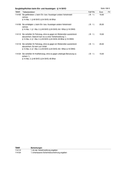 Sorgfaltspflichten beim Ein- und Aussteigen - § 14 StVO Seite 108/ 0 TBNR Tatbestandstext FaP-Pkt Euro FV 114100 Sie gefährdeten +) beim Ein- bzw. Aussteigen andere Verkehrsteil- ( B - 1) 10,00 nehmer. § 14 Abs. 1, § 49 StVO; § 24 StVG; 64 BKat 114106 Sie schädigten +) beim Ein- bzw. Aussteigen andere Verkehrsteil- ( B - 1) 25,00 nehmer. § 14 Abs. 1, § 1 Abs. 2, § 49 StVO; § 24 StVG; 64.1 BKat; § 19 OWiG 114112 Sie verließen Ihr Fahrzeug, ohne es gegen ein Weiterrollen ausreichend ( B - 1) 15,00 abzusichern. Dadurch kam es zu einer Verkehrsstörung *). § 14 Abs. 2, § 1 Abs. 2, § 49 StVO; § 24 StVG; 65 BKat; § 19 OWiG 114118 Sie verließen Ihr Fahrzeug, ohne es gegen ein Weiterrollen ausreichend ( B - 1) 25,00 abzusichern. Es kam zum Unfall. § 14 Abs. 2, § 1 Abs. 2, § 49 StVO; § 24 StVG; 65.1 BKat; § 19 OWiG 114124 Sie verließen Ihr Kraftfahrzeug, ohne es gegen unbefugte Benutzung zu ( B - 1) 15,00 sichern *). § 14 Abs. 2, § 49 StVO; § 24 StVG; 65 BKat TBNR Bemerkungen 114112 *) Art der Verkehrsstörung angeben 114124 *) Unterlassene Sicherheitsvorkehrung angeben