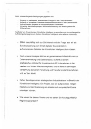 -4 - Dafür müssen folgende Bedingungen gegeben sein: Zugang zu preiswerter, erneuerbarer Energie für die Computerzentren Zugang zu schnellster Glas faser-Breitbandinfrastruktur für den Datentransfer - Ausreichendes Angebot an hochqualifizierten Fachkräften Attraktive Marktbedingungen, Wirtschaftsförderung und Anreizsysteme für Unternehmen Testfelder um Anwendungen Künstlicher Intelligenz zu erproben und eine umfangreiche Aufkläruпgskampagпe zum Nutzen Künstlicher Intelligenz seien ebenso notwendig. • BIWi beschäftigt sich zur Zeit intensiv mit der Frage, was wir als Bundesregierung zum Erhalt digitaler Souveränität im aufkommenden Zeitalter der Künstiichen Intelligenz tun müssen. • Nach unserer Analyse fehlt es an gemeinsamen Infrastrukturen zur Datenverarbeitung und Datenanalyse, es fehlt an einem strategischen Vehikel für Investments in Kl Unternehmen in der zweiten und dritten Wachstumsphase, und es fehlt an der engen Verzahnung zwischen Forschung und Transfer in die Unternehmen und auf den Markt. • Daher: benötigen einen strategischen Industrieakteur im Bereich der Künstlichen Intelligenz. Ein Projekt, das wir aufgrund des nötigen Kapitals und der Skalierung am ehesten auf europäischer Ebene umsetzen können. • Wie sehen Sie dieses Thema und wo sehen Sie Ansatzpunkte für Regierungshandeln?