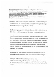 -6- Blockchain bietet in den Augen von Augustus die Möglichkeit, Informationen grenzüberschreitend zu kontrollieren, sichern und zu teilen. In den Augen der Verfasser ist die Blockchain-Technologie derzeit die sicherste dezentrale Datenbank. In dem Working Paper wird betont, dass der Zugang zu großen Datenmengen und spezialisierter Computerleistung essentiell sei, um Methoden der Küпstlicheп Intelligenz zu entwickeln und anzuwenden. Es wird dargestellt, dass Frankreich im Bereich Innovationen und Wachstum des Ökosystems besser da stehe als Deutschland. • Ich danke Ihnen für Ihre Analyse zu den Themen Künstliche Intelligenz und Blockchain. Sie haben sicherlich die Veröffentlichung der Strategie Künstliche Intelligenz vorige Woche verfolgt. • Die Bundesregierung wird 3 Milliarden Euro bis 2025 in Maßnahmen zur Entwicklung und Anwendung von Künstlicher Intelligenz investieren. . In der Strategie Künstliche Intelligenz ist ein ganzes Kapitel dem Thema Datenverfügbarkeit und -nutzbarkeit gewidmet, und die Bundesregierung wird verschiedene Maßnahmen umsetzen, um diese Ziele zu erreichen. Beispielsweise wollen wir Anreize schaffen, um das Teilen von Daten zu erleichtern. Zudem werden wir vermehrt öffentliche Daten verfügbar machen. In Bezug auf Nutzbarkeit setzen wir uns für interoperabilität und Standards von Daten ein. . Wir stimmen mit Ihnen überein, dass die rasanten Entwicklungen im Bereich Künstiiche lпtelligenz einen Bewusstseinswandel benötigen. • Deswegen ist Bestandteil der Strategie ebenso eine Kommunikationsstrategie für Künstiiche Intelligenz. Hierbei werden wir die Gemeinwohlorientierung und den menschenzentrierten Technikpfad betonen.