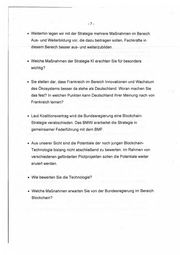 7 • Weiterhin legen wir mit der Strategie mehrere Maßnahmen im Bereich Aus- und Weiterbildung vor, die dazu beitragen sollen, Fachkräfte in diesem Bereich, besser aus- und weiterzubilden. • Welche Maßnahmen der Strategie K1 erachten Sie Юг besonders wichtig? • Sie stellen dar, dass Frankreich im Bereich Innovationen und Wachstum des 4kosystems besser da stehe als Deutschland. Woran machen Sie das fest? In welchen Punkten kann Deutschland Ihrer Meinung nach von Frankreich lernen? • Laut Koalitionsvertrag wird die Bundesregierung eine Blockchain- Strategie verabschieden. Das BMWi erarbeitet die Strategie in gemeinsamer Federführung mit dem BMF. • Aus unserer Síсht sind die Potentiale der noch jungen Blockchain- Technologie bislang nicht abschließend zu bewerten. Im Rahmen von verschiedenen geförderten Pilotprojekten sollen die Potentiale weiter eruiert werden. • Wie bewerten Sie die Technologie? . Welche Maßnahmen erwarten Sie von der Bundesregierung im Bereich Blockchain?