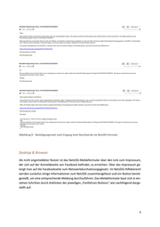 Abbildung 8 – Bestätigungsmails nach Eingang einer Beschwerde via NetzDG-Formular Desktop & Browser Als nicht angemeldeter Nutzer ist das NetzDG-Meldeformular über den Link zum Impressum, der sich auf der Anmeldeseite von Facebook befindet, zu erreichen. Über das Impressum ge- langt man auf die Facebookseite zum Netzwerkdurchsetzungsgesetz. Im NetzDG-Hilfebereich werden zunächst einige Informationen zum NetzDG zusammengefasst und ein Button bereit- gestellt, um eine entsprechende Meldung durchzuführen. Das Meldeformular baut sich in ein- zelnen Schritten durch Anklicken der jeweiligen „Fortfahren-Buttons“ wie nachfolgend darge- stellt auf: 9