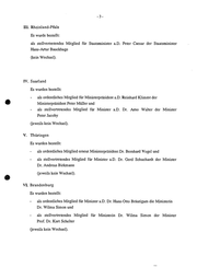 -3- IH. Rheinland-Pfalz Es wurde bestellt: als stellvertretendes Mitglied für Staatsrninister a.D. Peter Caesar der Staatsrninister Hans-Artur Bauckhage (kein Wechsel). TV. Saarland Es wurden bestellt als ordentliches Mitglied für Ministerpräsident a.D. Reinhard Klimmt der Ministerpräsident Peter Müller und als stellvertretendes Mitglied für Minister a.D. Dr. Arno Walter der Minister Peter Jacoby (jeweils kein Wechsel). V. Thüringen Es wurden bestellt: als ordentliches Mitglied erneut Ministerpräsident Dr. Bernhard Vogel und als stellvertretendes Mitglied für Minister a.D. Dr. Gerd Schuchardt der Minister Dr. Andreas Birkmann (jeweils kein W echsel). VI. Brandenburg Es wurden bestellt: als ordentliches Mitglied für Minister a.D. Dr. Hans-Otto Bräutigam die Ministerin Dr. Wilma Simon und als stellvertretendes Mitglied für Ministerin Dr. Wilma Simon der Minister Prof. Dr. Kurt Schelter (jeweils kein Wechsel).