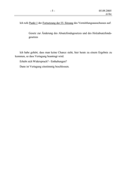 -4- 05.09.2005 zi-bo Ich rufe die 2. Fortsetzung der 54. Sitzung des Vermittlungsausschusses auf: Gesetz zur Stärkung der gesundheitlichen Prävention Auch hier ist mein Kenntnisstand, dass Vertagung gewünscht wird. Ich darf fragen, wer dem Vertagungsantrag widerspricht. - Enthält sich jemand? Dann ist dieser Punkt einstimmig vertagt.
